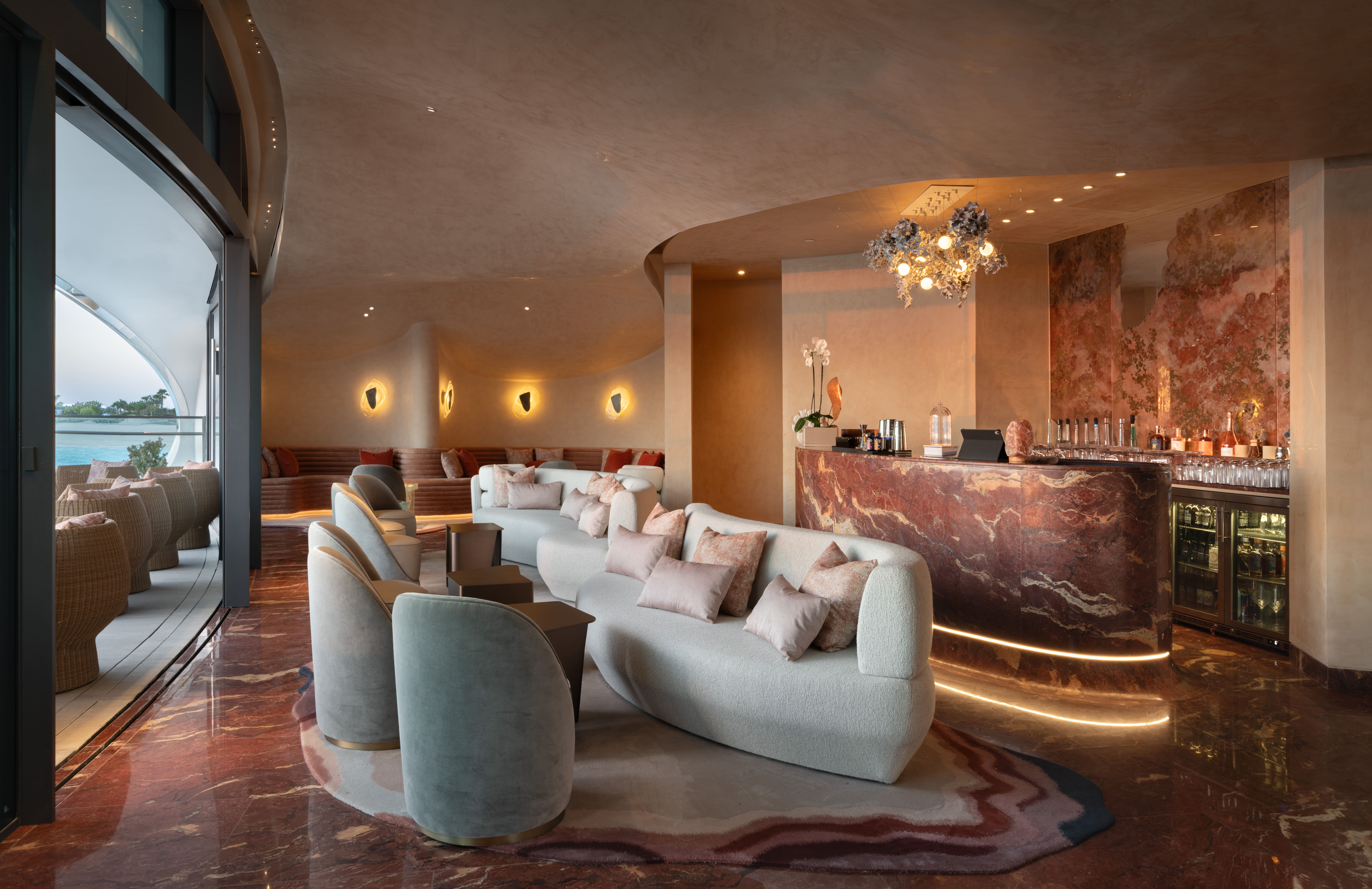 Dining venues push the narrative further. At Ariamare, a Mediterranean concept by Michelin-starred Chef Marco Garfagnini, Ultimo Neon TV is deployed in custom runs beneath bar counters to bring warmth and identity to the venue. At Solera, Shebara’s avant-garde sunset lounge, Ultimo Neon 16 TV traces the base of the bar front, casting a soft accent light that mirrors the horizon—elevating sunsets into ritual.